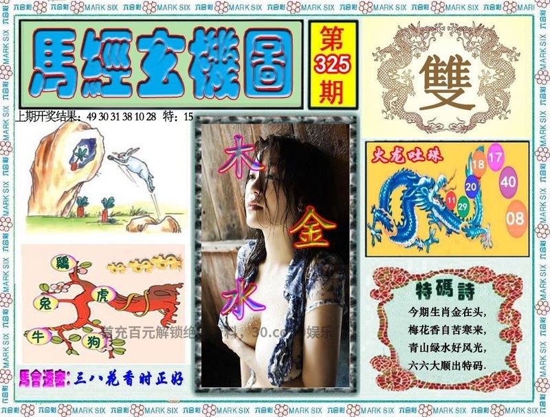 325期:马经玄机: 馬會透密:三八花香时正好 必中五肖:龙兔牛虎狗 |